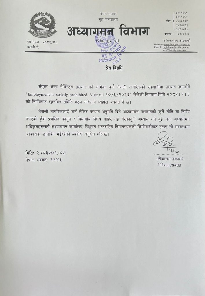 विमानस्थलबाट यूएई प्रस्थान गर्न लागेका नेपालीको राहदानीमा प्रस्थान छापसँगै ‘रोजगारी पूर्ण रूपमा निषेध गरिएको छ’ भन्ने व्यहोरा लेखिएको फेला परेपछि यो विवाद बाहिर आएको थियो । सोही विषयमा सत्यतथ्य पत्ता लगाउन विभागले गत वैशाख ३ गते नै छानबिन समिति गठन गरेको थियो।